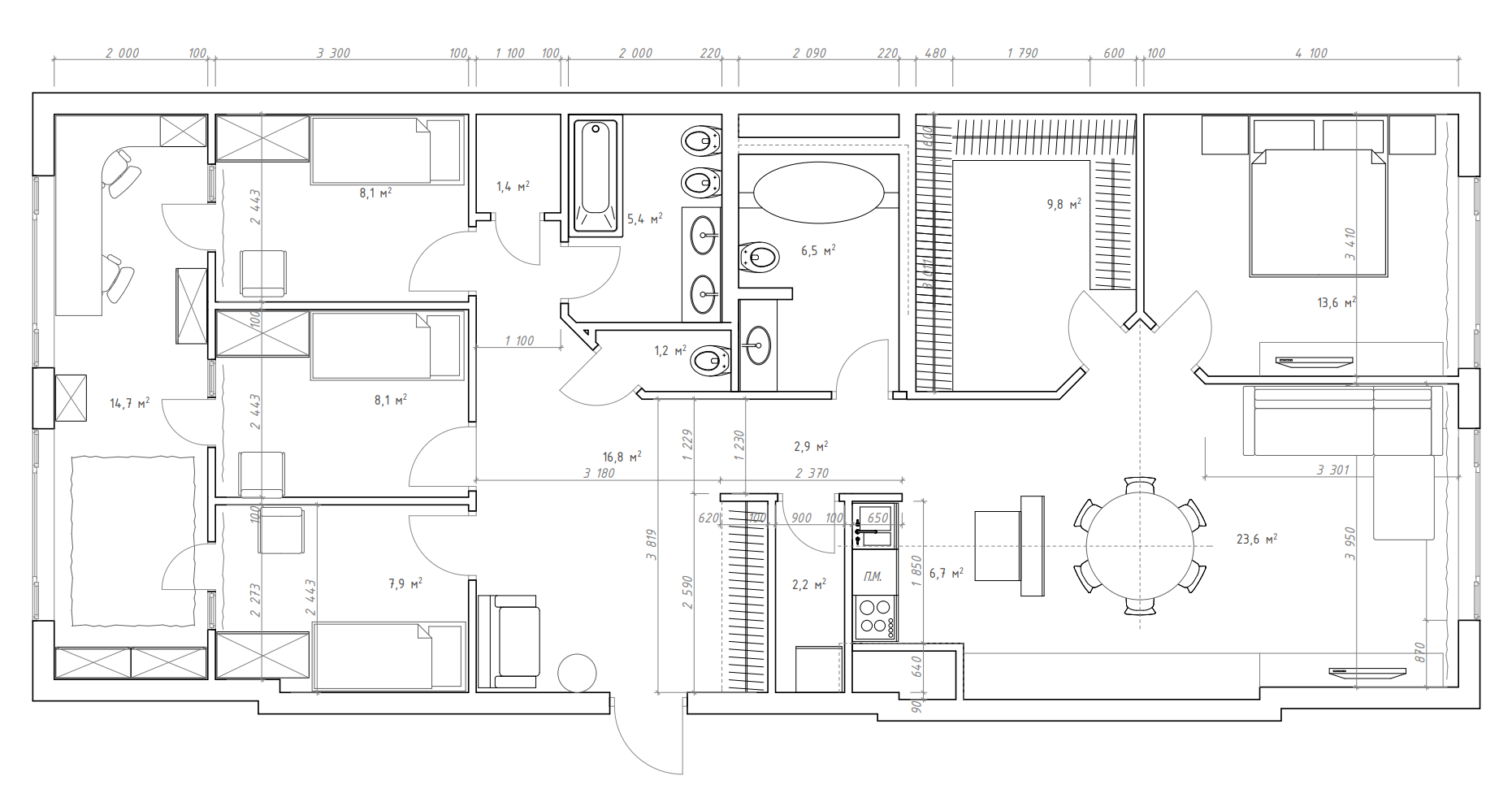 Планировка: 3 детские спальни + отдельная игровая комната 15 м². Родительская зона изолирована.